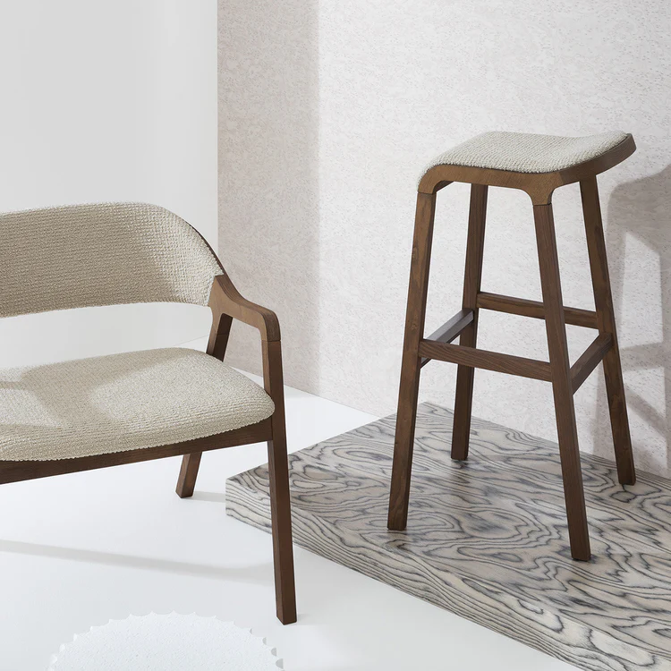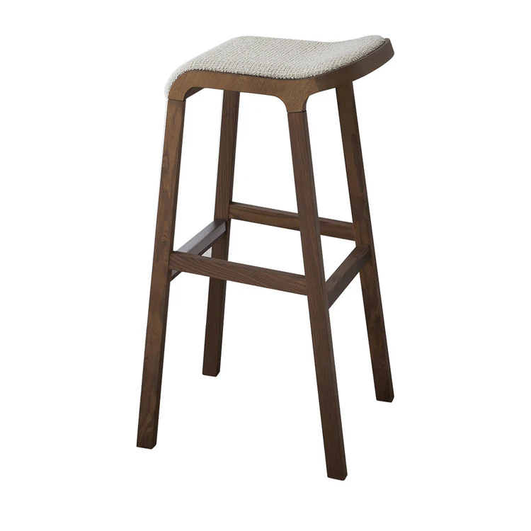 This exquisite stool is a spot-on addition to rustic and warm-toned modern decors. Its frame in solid ash is tinted in mahogany brown, hue preserving the timeless charm of top-rate timbers and imbuing the design with an even more intense personality. The 74cm-high seat flaunts an alluring, wave-like profile and soft off-white upholstery. Contract and commercial certifications available upon request.